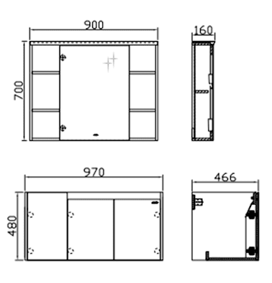 | Tủ gương (Mirror Cabinet) | Kích thước: 900 × 160 × 700 mm |