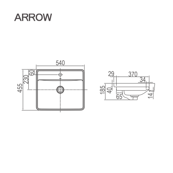 Kiểu dáng bán âm (một phần đặt trên mặt bàn, một phần âm xuống) mang lại cảm giác liền mạch và rộng rãi hơn so với lavabo đặt bàn truyền thống. Chậu rửa lavabo bán âm Arrow AP41007C sở hữu kích thước 540x455x185mm – vừa đủ lớn để sử dụng thoải mái nhưng không chiếm nhiều diện tích.