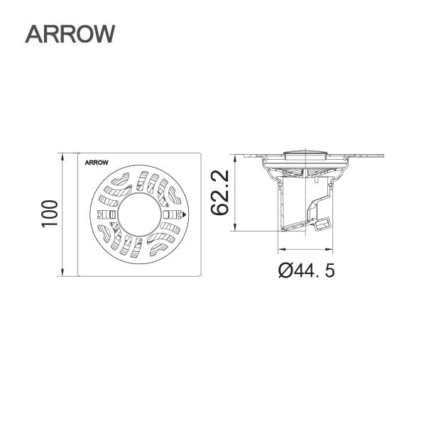 Phễu thoát sàn Arrow AG5116B được thiết kế với hình vuông nhỏ gọn (100×100×47mm), phù hợp với hầu hết các loại sàn phòng tắm, nhà vệ sinh, sân phơi hay khu bếp.